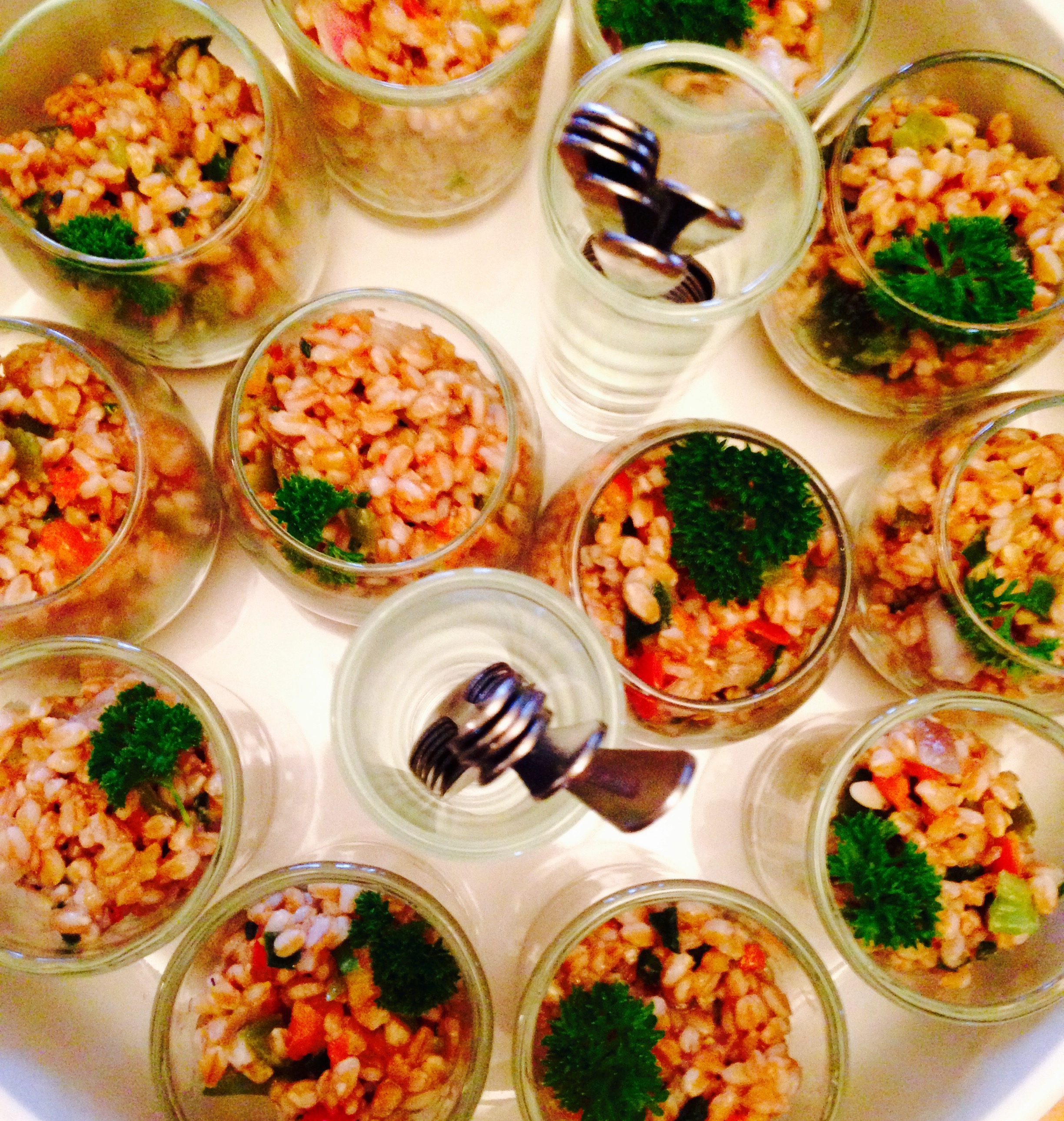 Appetizers: Veges & Hummus, Chips & Guacamole, Mini Farro Salads