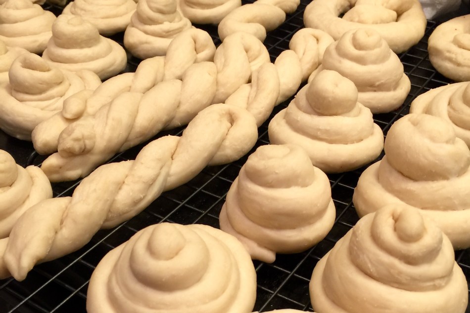 - Later, heat oven to 375. Cut dough into 16 pieces and roll into fun shapes (we tried classic, hearts, snails, twists, and swirls). There is no perfection here, just play with it and have fun. Make sure to make similar sizes so they bake evenly.