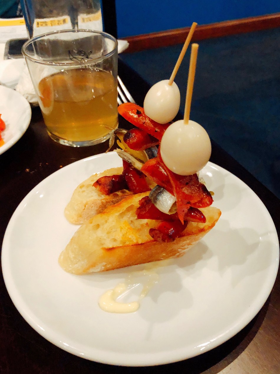 For the Devour menu, we had a choice of 3 pintxos, 2 “for the table” plates, and 1 dessert for $30. $30 for 2 people isn’t bad. Ciders were sold individually ranging from $4-$6. Husband and I shared braised beef, shrimp a la plancha, txistorra chorizo, patatas bravas, fritters, and “burnt” cheesecake. All sounds good, right?