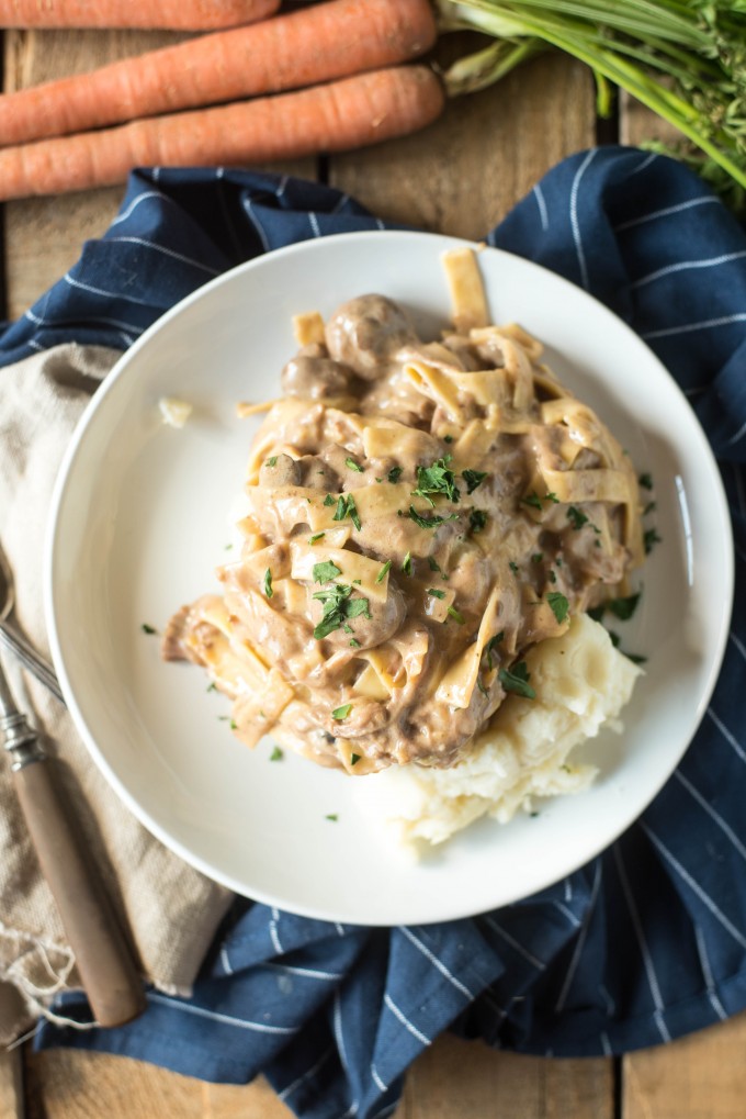 This semester has been a bit of a wild one as Husband and I continue to have pretty opposite schedules and my frequent night classes have turned me into a bit of a zombie. I’m never quite sure when to eat now. Eat at 5pm before class? But then I’m hungry at 10:30pm when I get home from class. Husband just walks around the kitchen confused, never knowing if he should make himself something while I’m out or wait until I get home and have an urgent pizza craving. The result of all of this is that I’ve basically turned into a snacker. I just fill my backpack with fruit bars, almonds, oranges, and cheese sticks and hope my stash keeps me moving throughout the day. This seems to be working until I finally cave and really just want to eat a hot meal that doesn’t come out of a smashed package and then I go back and pull out the good old crock pot and prepare some beef and noodles.