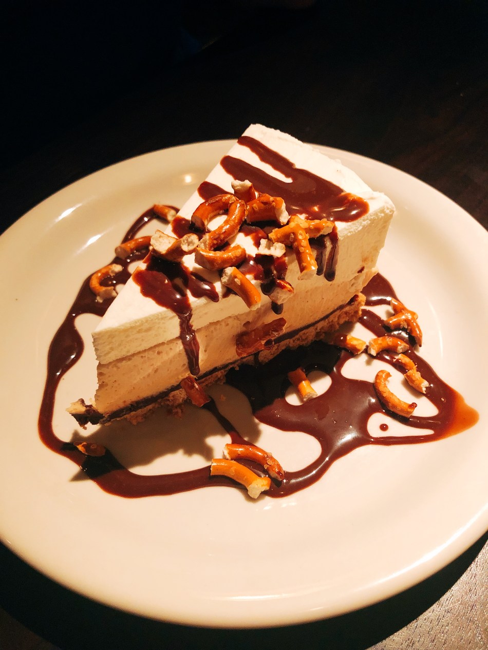 Sister and I ended up splitting Lump Crab Hushpuppies ($11) and Truffle Chips ($8) for our appetizers, but it was a hard choice because options like cheesy monkey bread and cornbread muffins were also on the menu. For my entrée, I went with Baked Mac and Cheese with cavatappi noodles, thick-cut bacon, english peas, and a parmesan crust ($16). Sister ordered a 1/2 rack of Hickory Smoked Baby Back Ribs ($16). I was almost too full for dessert, but when I saw Peanut Butter Pretzel Pie ($8) was an option, I had to give it a try. See what I mean? Comfort food! So many good choices on the menu!